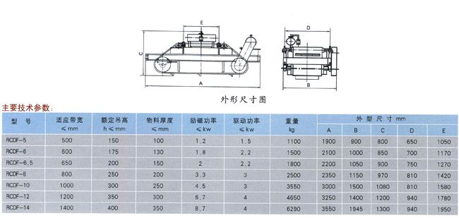 采RCDF系列油冷自卸式電磁除鐵器是在RCDE系列油冷懸掛式電磁除鐵器的基礎上增加了驅動電機、滾筒、帶刮板的卸鐵膠帶等組成的卸鐵機構。具有磁力大、散熱快、防塵、防雨、耐腐蝕、連續(xù)工作、維護費用低等優(yōu)點。問世以來,以操作使用方便、故障率低、維護量小等特點贏得了廣大用戶的好評。